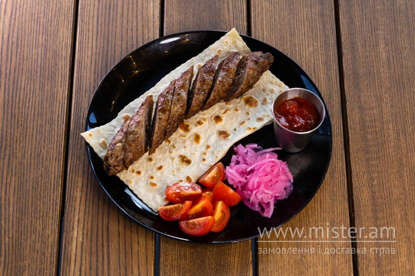 Люля-кебаб, цибуля маринована, соус шашликовий, чері, лаваш.
