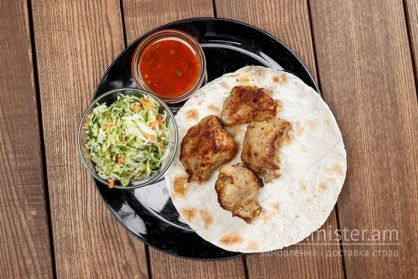 Ошийок, лаваш, соус шашликовий, салат з капусти.