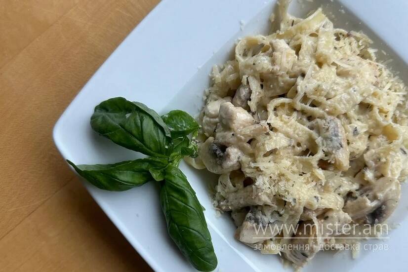 Паста фетучіні з курячим філе, печерицями та цибулею у вершковому соусі з пармезаном.