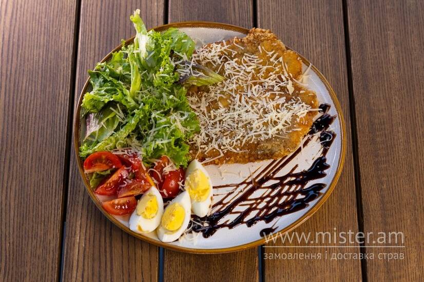 Курячий шніцель в поєднанні з міксом салату, чері, перепелиними яйцями та пармезаном в соусі цезар.