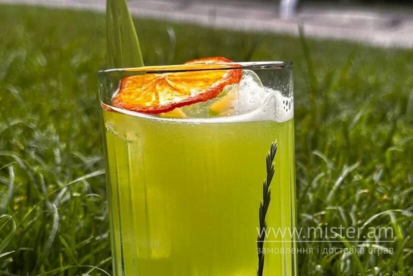 Сік апельсин, сік ананас, сироп зелений банан, фреш лимону, содова.