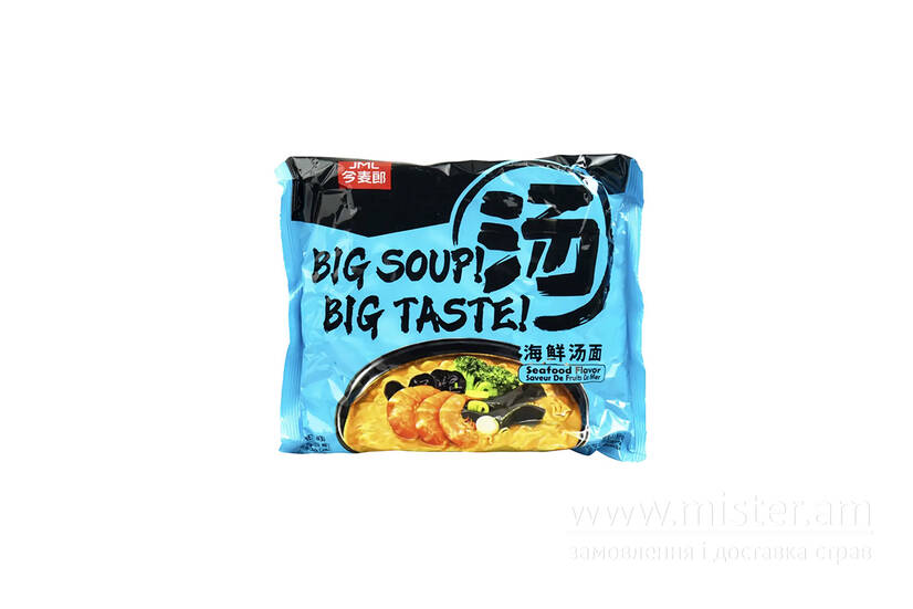 Локшина Big Soup зі смаком Морепродуктів JML - локшина швидкого приготування з насиченим бульйоном зі смаком морепродуктів у великому форматі порції. Має глибокий аромат моря, збалансований солонувато-пряний смак і приємну насиченість, що добре зігріває та надовго дарує відчуття ситості. Ідеальний варіант для швидкого обіду або вечері, коли хочеться чогось ароматного, яскравого та поживного.
