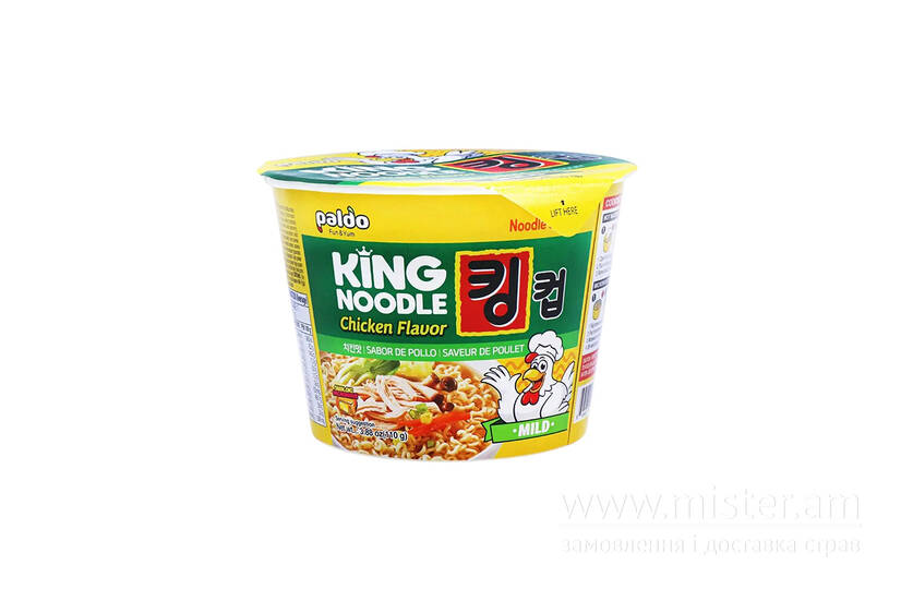 King Noodle Chicken Flavor зі смаком курки - класичний корейський суп швидкого приготування. На батьківщині таке блюдо часто можна зустріти на візках торговців вуличною їжею. Поживний, ароматний, не гострий обід швидко наситить і підбадьорить.