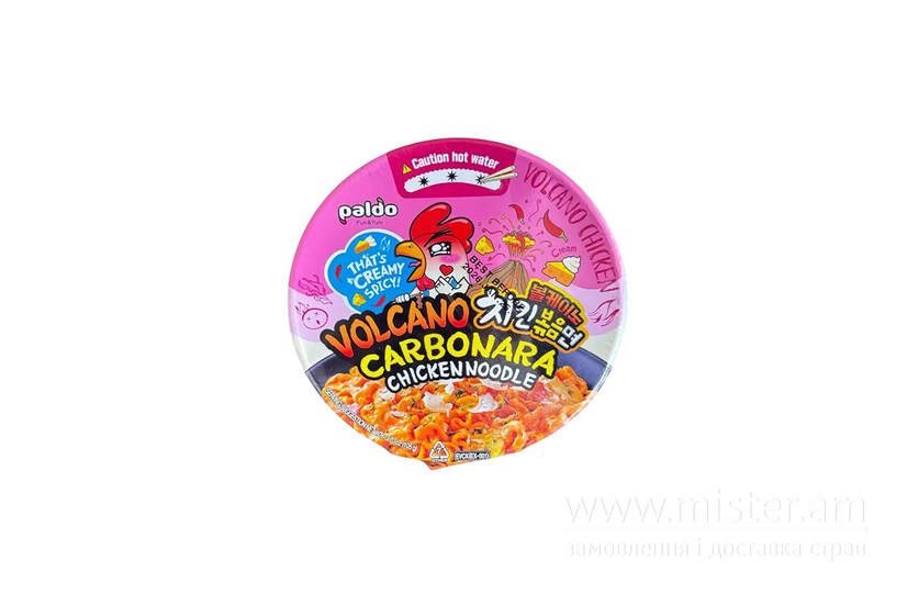 Виготовлена в Кореї, ця локшина ідеально підходить для обіду, який не знає компромісів. Упаковка Volcano Carbonara Chicken Noodle Chicken Noodle Paldo містить боул із локшиною, пакетик із гострим соусом та пакетик із вершково-сирною приправою.