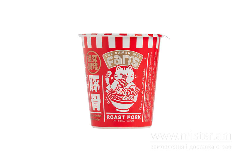 Азійська локшина Fan’s Roast Pork у стильному яскравому стакані — це швидкий, ситний та ароматний перекус із насиченим смаком смаженої свинини. Бульйон має приємні м’ясні ноти, легку пікантність та виражений умамі-смак, а локшина виходить пружною та ідеальною за текстурою.