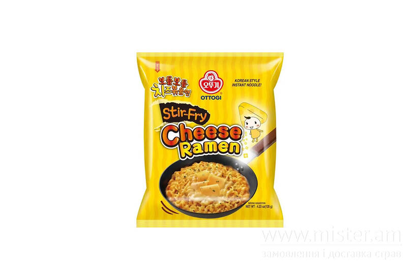 Cheese Ramen Stir-Fry від Ottogi - ще один варіант неперевершеного тандему гострих і сирних приправ, прекрасно поєднуються з ніжним раменом. На цей раз без бульйону. Рамьон досить ситний, він швидко вгамує почуття голоду, а також зігріє і наповнить енергією. Упаковку сирного рамена зручно брати з собою в поїздки, подорожі, походи, адже на його приготування потрібно лише кілька хвилин.