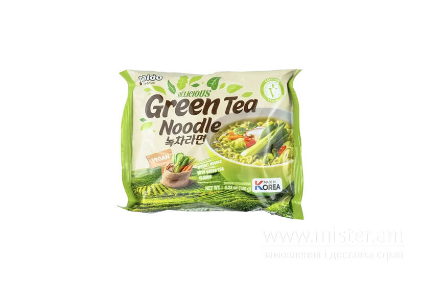 Суп рамьон вегетаріанський Green Tea Paldo — це оригінальна корейська локшина з додаванням зеленого чаю, яка має легкий, освіжаючий і трав’янистий смак. Бульйон виходить ніжним, з легкою гірчинкою зеленого чаю.