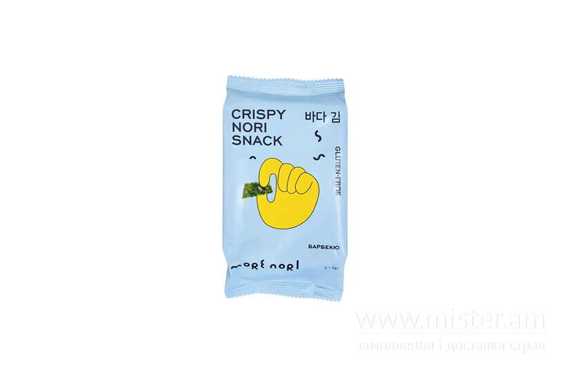 Crispy Nori Snack — це тонкі обсмажені листи морської капусти норі з насиченою димною ноткою BBQ. Поєднання легкої солоності, приємної пряності та характерного смаку барбекю створює ідеальний баланс для швидкого перекусу. Ідеальний варіант для швидкого перекусу без зайвих калорій: мінімум ваги — максимум смаку.