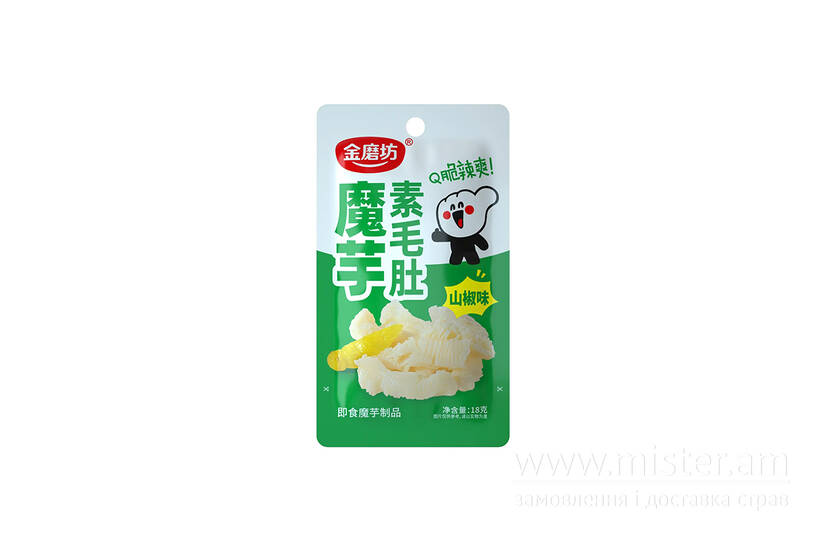 Снек із конжаку з кисло-гострим смаком — цей легкий, хрусткий делікатес із конжака здивує свіжим і пряним смаком зеленого перцю шичуанського стилю. Ідеально імітує текстуру яловичого шлунка, але абсолютно без м'яса - 100% веган! Смак пікантний, з легкою терпкістю і приємною пружністю.