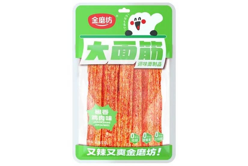 Латяо Big Latiao Spicy Chicken Flavor від Golden Mill — Це м’які, тягучі смужки з пшеничного тіста, просочені пряним соусом зі смаком гострої курки з перцем. Поєднання солонувато-гострого смаку та насиченого аромату робить їх ідеальним снеком для любителів азійської кухні.