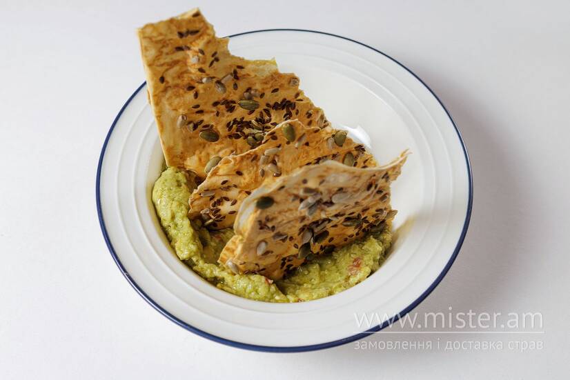 Авокадо, помідор, червона цибуля, оливкова олія, фреш лайму, перець чилі.
