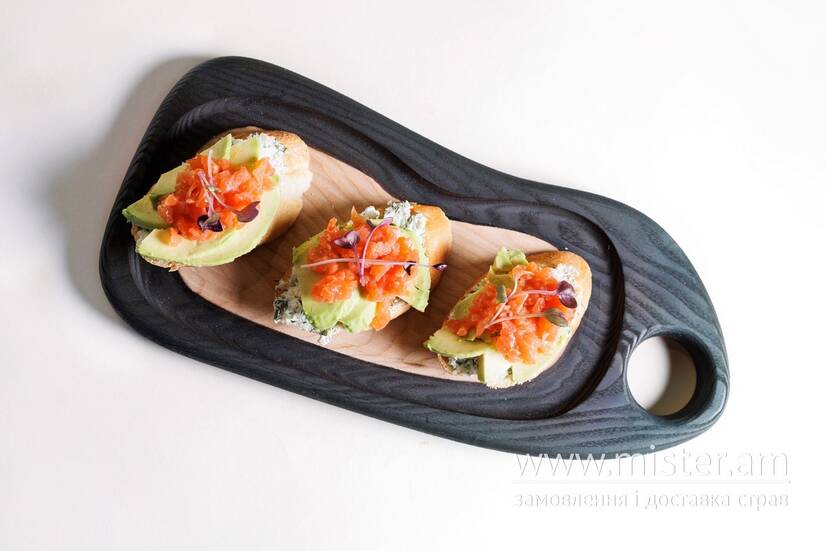 Лосось власного посолу, авокадо, тартар з фермерського сиру, маринованого огірка та зелені.