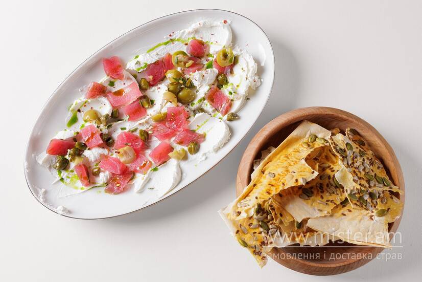 Сир Філадельфія, свіжий тунець, оливки, каперси, розмарин та пластівці перцю чилі.