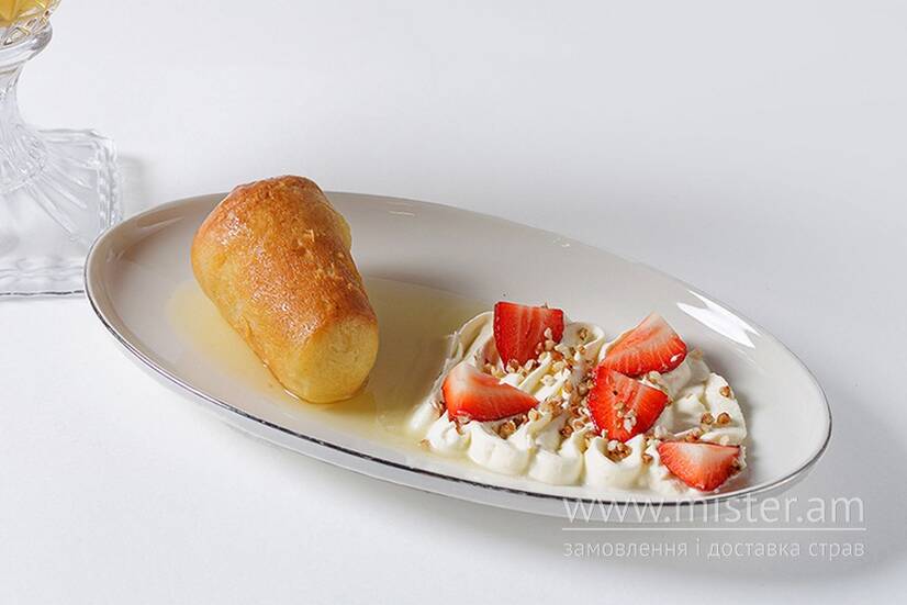 Бісквіт, просочений сиропом на основі рому з кремом Шантильї та фруктами.