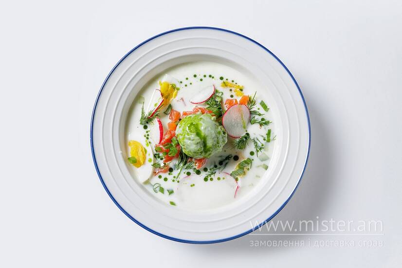 Окрошка на основі айрану з лососем власного посолу, курячим яйцем, кропом, зеленою цибулею, відварною картоплею, свіжим огірком та редисом. Подаємо з кулькою морозива з кропу.