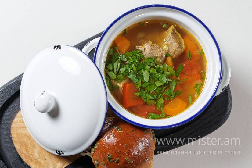 Наваристий суп зі спеціями, яловичина, картоплі, морква, цибуля, солодкий перець, чилі, помідор. Подається з пампушкою.