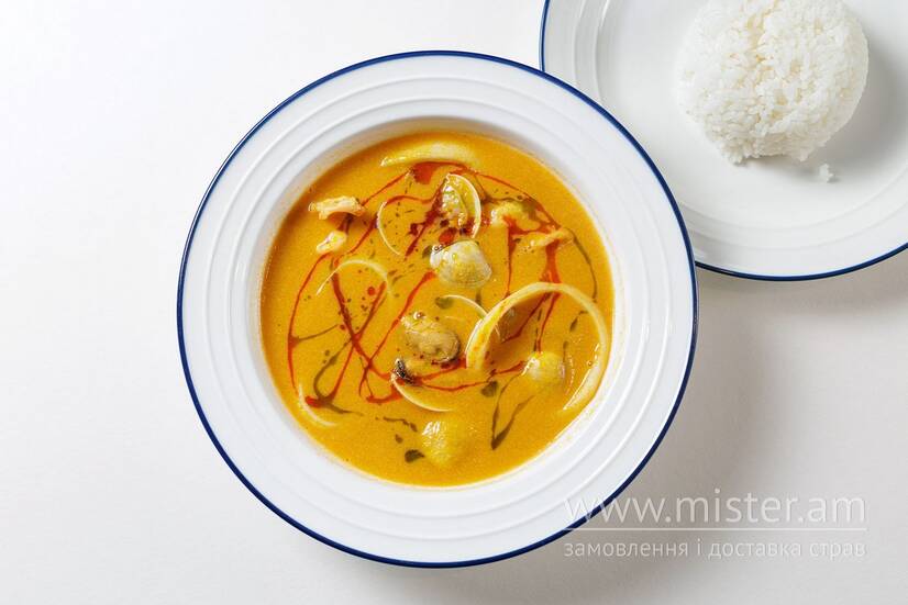 Ніжний суп на основі Біску, мідії, кальмари, креветка та клеми, в поєднанні з кукурудзою та рисом.