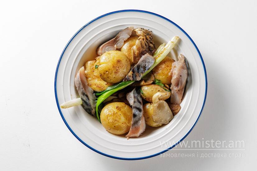 Скумбрія (слабосолона) зі смаженою картоплею, печерицями та зеленою цибулею.
