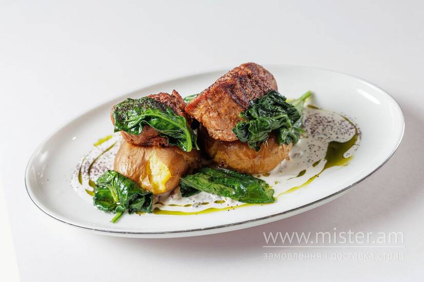 Медальйони зі свинини з запеченою картоплею, шпинатом та грибним соусом.