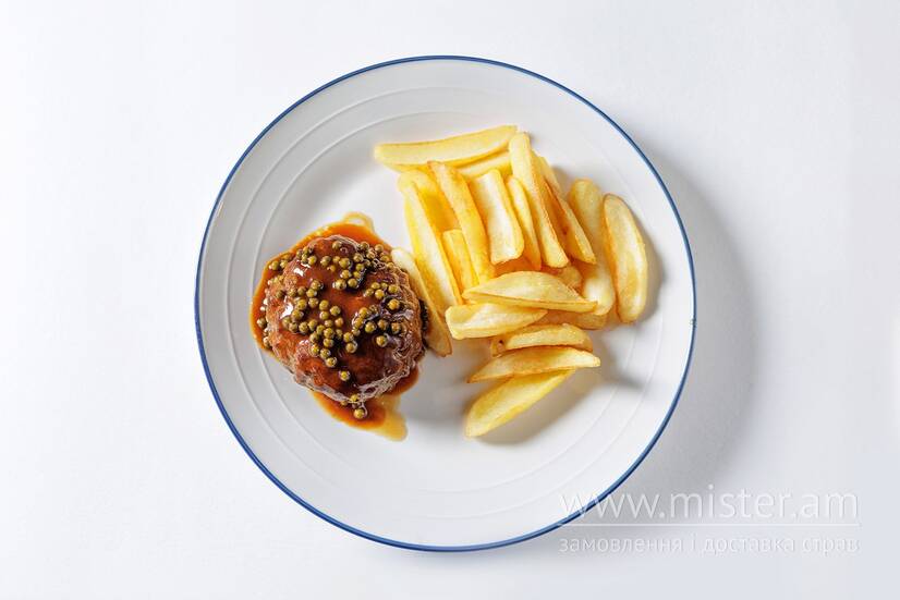 Соковитий біфштекс із рубленої яловичини, подаємо з картопляними діпами та соусом демігляс з зеленим маринованим перцем.