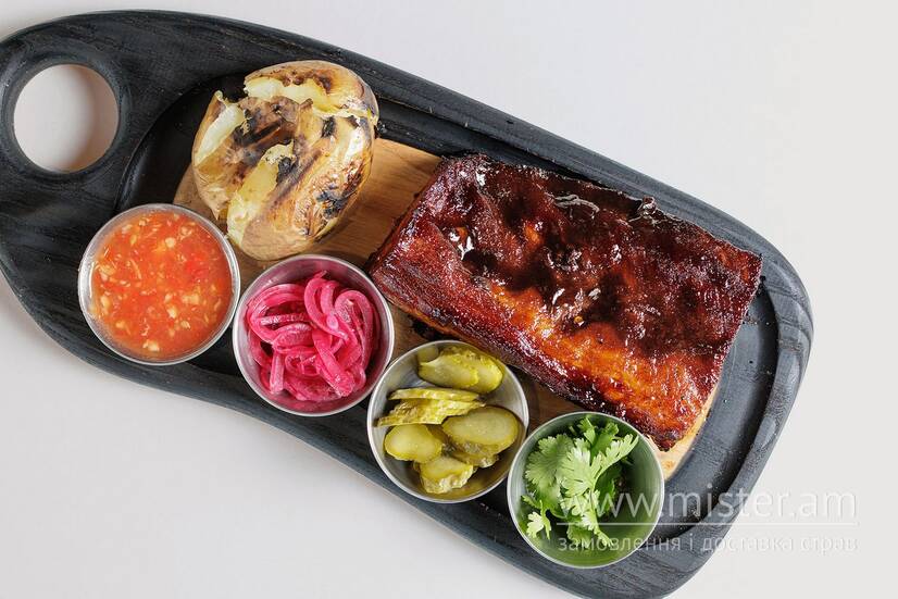 Ребра в соусі барбекю з печеною картоплею, цибулею в малиновому маринаді, аджикою, маринованим огірком та кінзою.