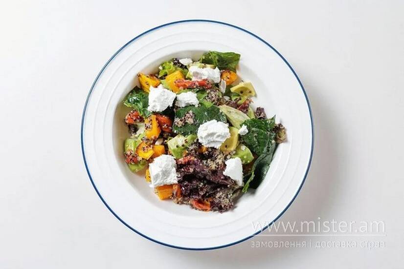 Вітамінний салат, кіноа, печений гарбуз та солодкий перець, авокадо, сир Фелата та соус апельсиновий Дресинг.