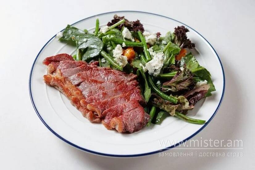 Вітамінний салат, спаржева квасоля, печений гарбуз,сир Дор Блю, стейк Нью Йорк та соус Вінегрет.