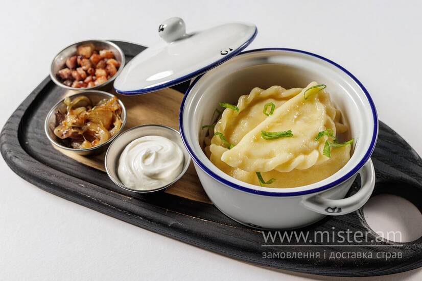 Вареники з картоплею, подаємо окремо: шкварки, смажена цибуля та сметана.