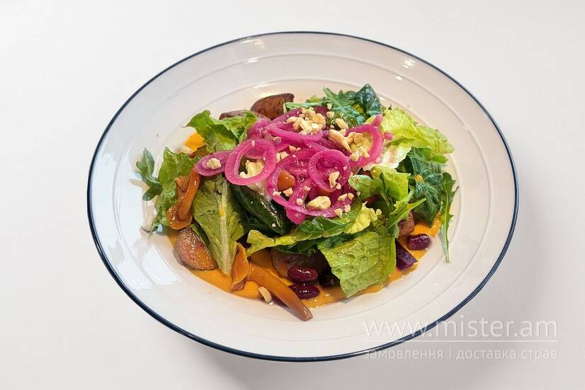 Червоний запечений буряк, соус вінігрет, крем з моркви, смажена картопля, маринований огірок, червона квасоля, мікс салату, мариновані гриби, малинова маринована цибуля та горіхи.