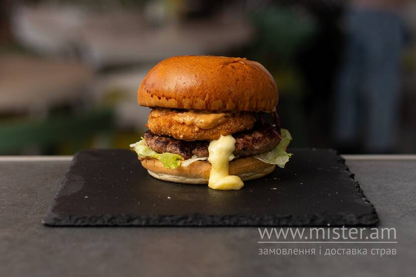 Булочка бріош підсмажена на вершковому маслі, котлета з яловичини, смажений сир камамбер в паніровці, мариновані огірочки, салат айсберг, цибулевий конфітюр і наш фірмовий соус. Це той самий соковитий бургер, смак якого Ви не зможете забути. Зовнішній вигляд страви може відрізнятися від зображеного на фото.