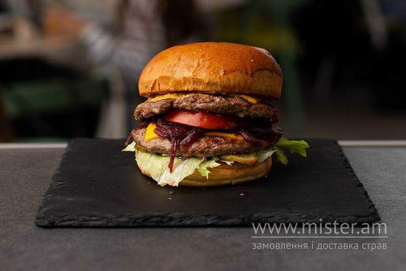 Булочка бріош підсмажена на вершковому маслі, подвійна котлета з яловичини, подвійна порція сиру, хрусткий солоний огірочок, салат айсберг, скибочка свіжого помідору та цибулевий конфітюр, що додає йому особливої пікантності. Дабл наsoloda гарантована! Зовнішній вигляд страви може відрізнятися від зображеного на фото.