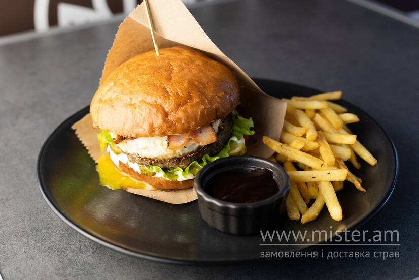 Цей красунчик є фаворитом серед наших гостей. М`яка булочка бріош, котлета, яйце "глазунья", смажений бекон, солоненький огірочок, салат айсберг та фірмовий соус. Подаємо з картоплею фрі та кетчупом. Зовнішній вигляд страви може відрізнятися від зображеного на фото.