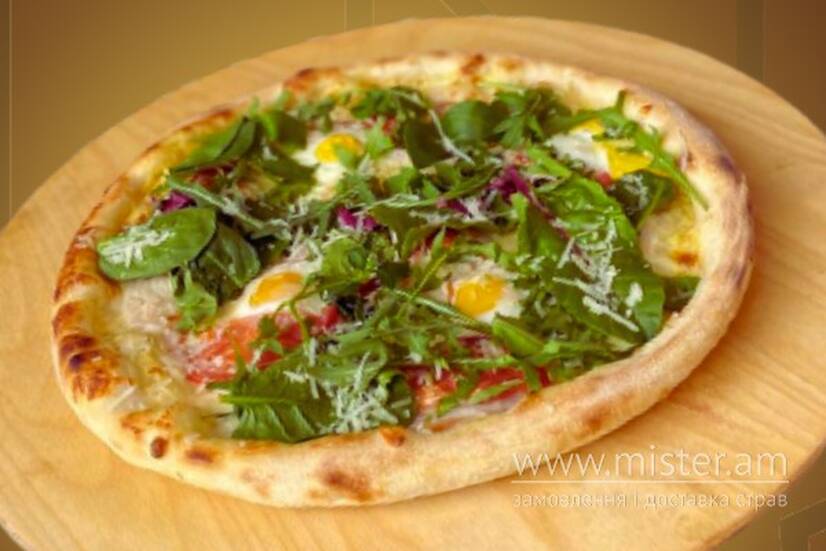 Тісто дріжджове, соус гірчичний, соус цезар, сир моцарелла, філе куряче копчене, помідор свіжий, яйця перепелині, мікс салату, сир пармезан.
