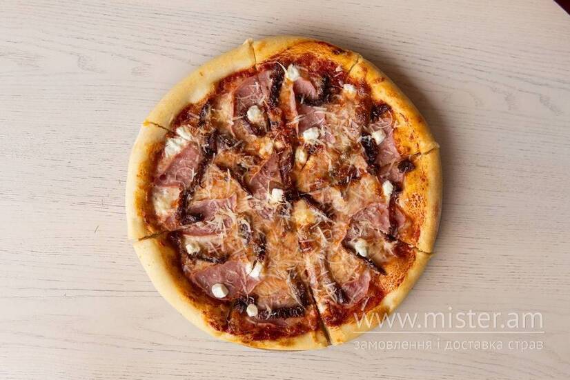 Соус пелаті, сир моцарела, шинка, томат в`ялений, фелата, сир пармезан.