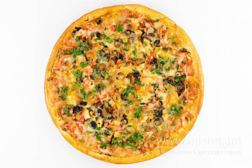 Куряче філе, печериці, кукурудза, маслини, помідор, моцарела, спеції. 1 шматок піци
