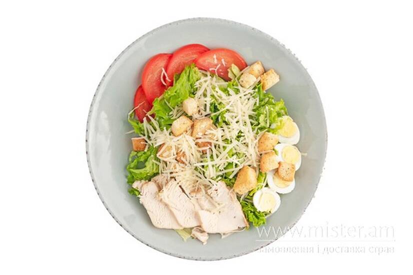 Листя салату, салат Айсберг, куряче філе, перепелині яйця, помідори, крутони, соус Цезар, пармезан.