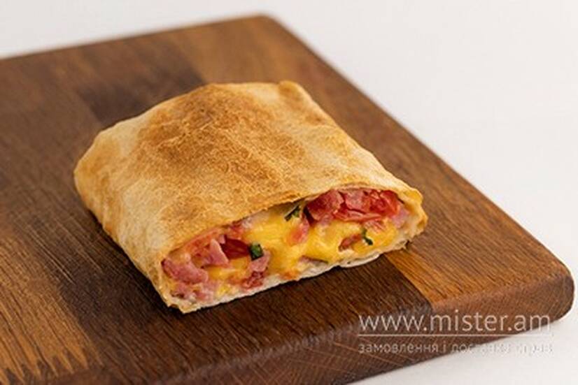 Шинка, сир, свіжі помідори, зелень, спеції.