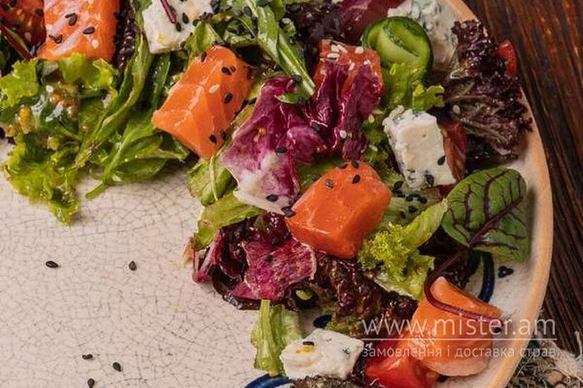 Слабосолена форель, Дорблю, огірок, мікс салату, черрі, лимон, кунжут, гірчична заправка.