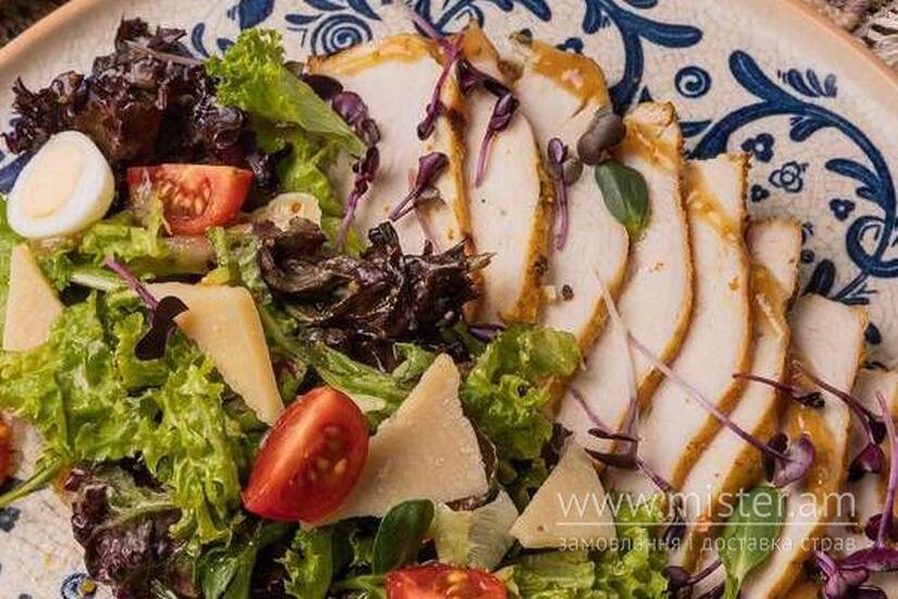 Листя салату, куряча грудка, томати чері, перепелині яйця, гірчична заправка, сир Пармезан.