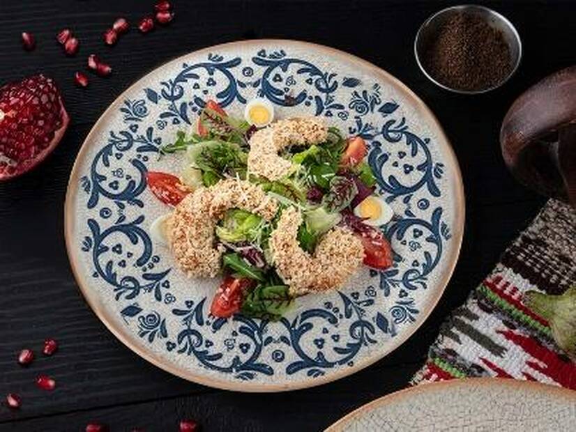 Листя салату, рукола, помідор чері, яйце перепелине, креветка, соус гірчичний, мікрозелень, олія соняшникова, сир пармезан.