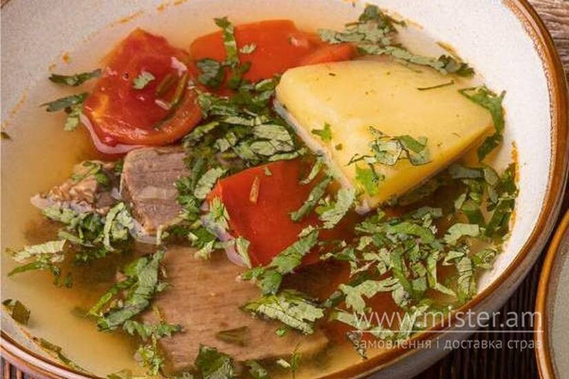 Яловичий бульйон з овочами, паприкою, томатами та картоплею.