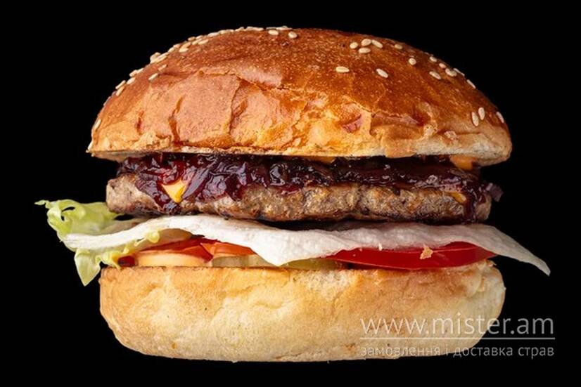 Котлета з яловичини, сир Чеддер, салат Айсберг, огірки мариновані, помідори, соус бургер, цибуля карамелізована.