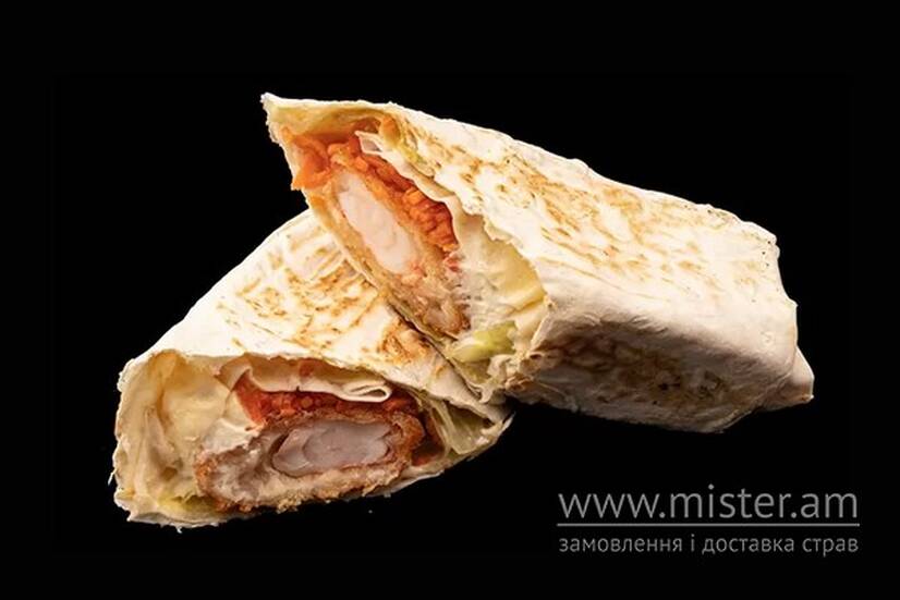 Лаваш, риба тілапія, капуста пекінська, огірок, морква, цибуля синя, часникова заправка, соус огірково-версковий.