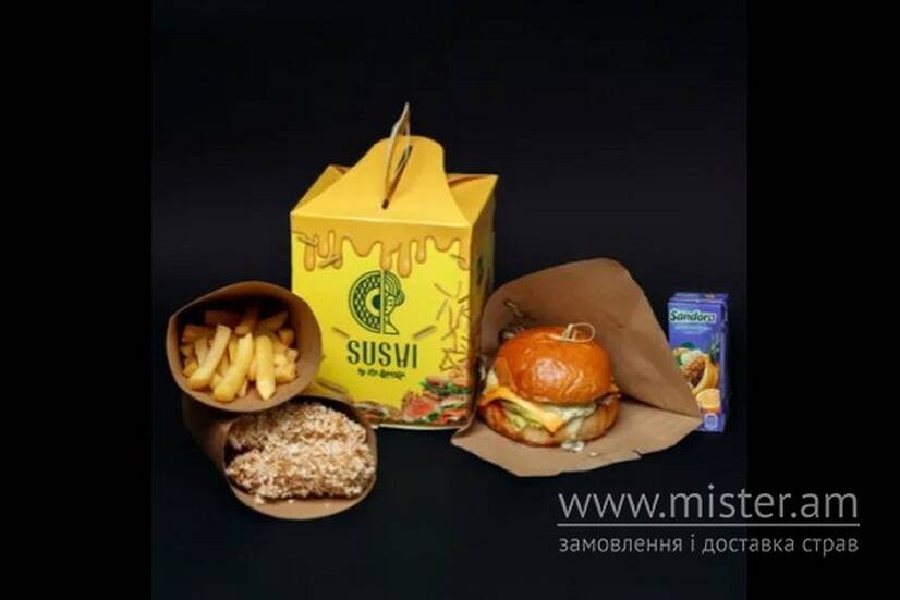 Бургер Cheese дитячий, курячі нагетси, картопля фрі, сік.