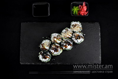 Вугор, крем-сир, огірок, соус унагі, рис, водорості норі.