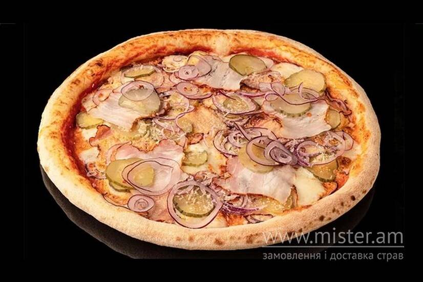 Бекон, сир моцарелла, яйце куряче, сир пармезан, цибуля червона, соус пілаті, огірки мариновані.