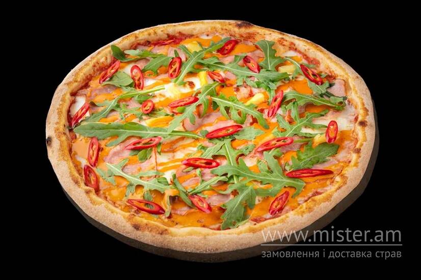 Шинка, сир моцарелла, соус пілати, майонез, ананас, перець чілі, руккола.