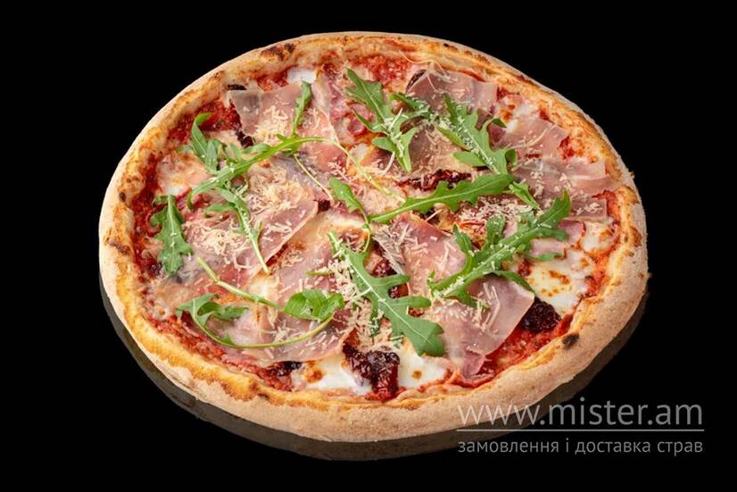 Прошутто, сир моцарелла, соус пілаті, сир пармезан,бекон,руккола, томати в`ялені.