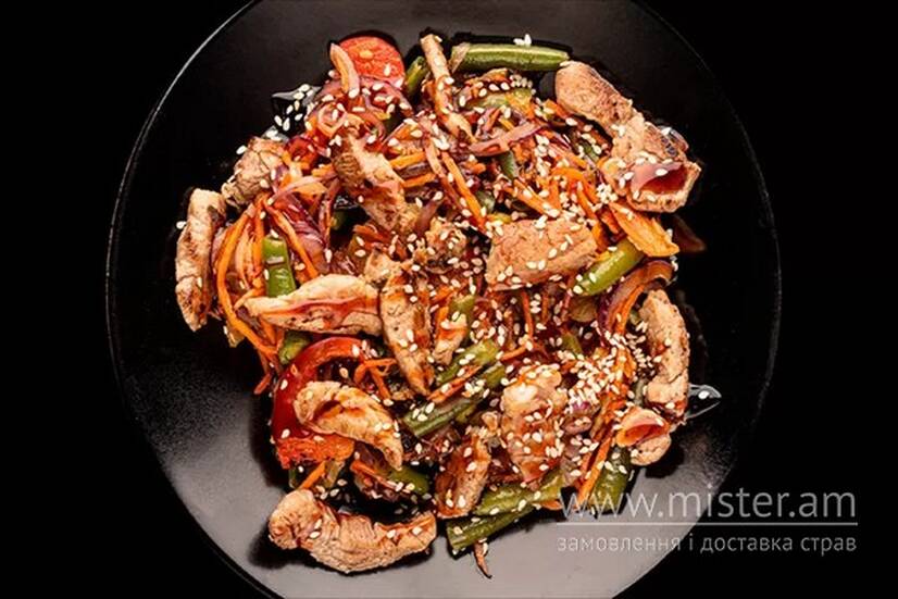 Свинина, перець солодкий, морква, цибуля синя, спаржева квасоля, цибуля зелена, селера, соус унагі, кунжут.