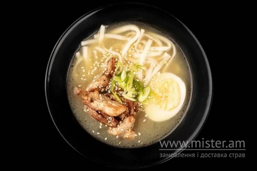 Бульйон курячий, філе свинини, локшина удон, яйце, цибуля зелена, кунжут.